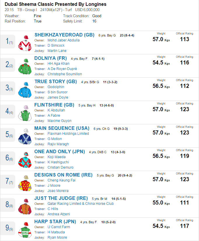 One And Only (Heart`s Cry – Virtue (Taiki Shuttle)) – с жокеем Кристианом Демуро стартовал с отметки 1000 метров и сделал хороший галоп по прямой травяного трэка ипподрома Мейдан.