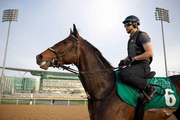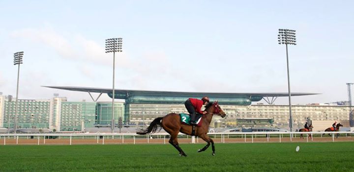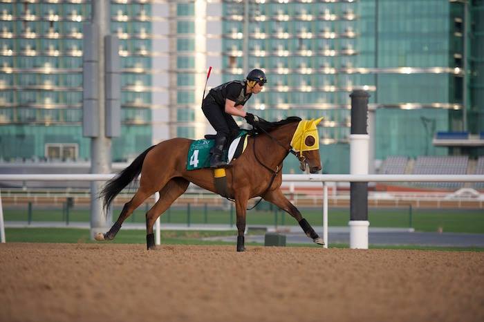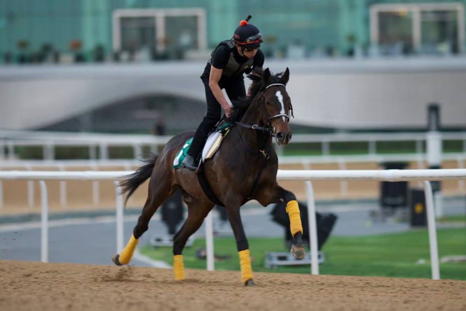 HARP STAR (Deep Impact – Historic Star (Falbrav)) – победительница японских 1000 Гиней усердно работает по песчаному покрытию ипподрома Мейдан.