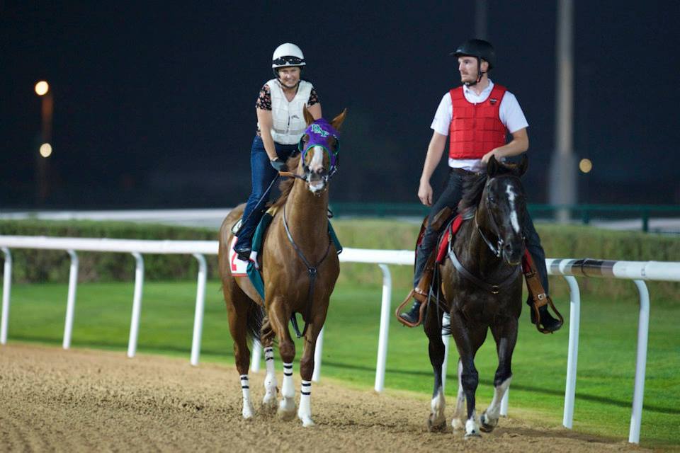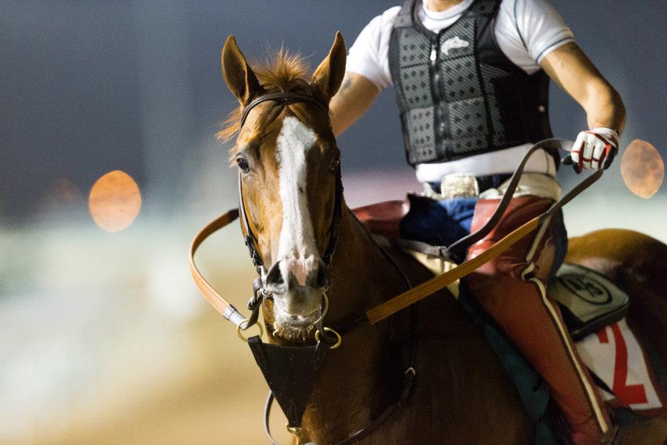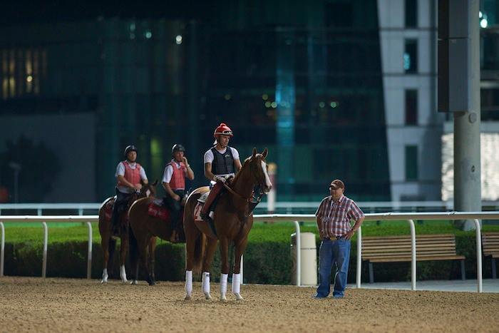 Калифорния Хром (Lucky Pulpit – Love The Chase (Not For Love)) – с райдером Даной Барнес, провел сегодня утром (24.03.15) свой галоп на 800 метров на основном покрытии ипподрома Мейдан.