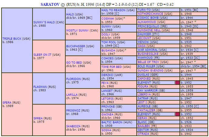Саратов имеет инбридинг 5x5 на жеребца Элемент (25 starts: I-12, II-2, III-3, IV-3), отца знаменитого Анилина.