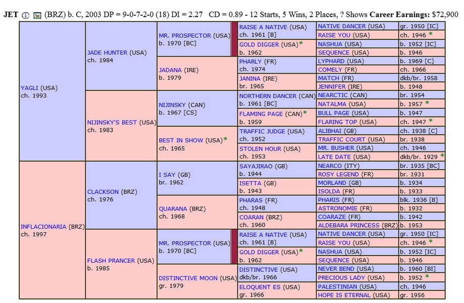 Мать ДЖЕТа Инфлационария – дочь чемпиона Бразилии Клаксона, который претендует на звание лучшего производителя страны всех времен. Клаксон имел 15 побед при 23 стартах, а затем произвел целое созвездие бразильских чемпионов.