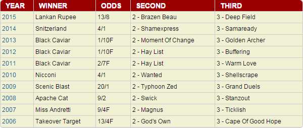 Помимо Блэк Кавиар эту знаменитую скачку Австралии выиграли Lankan Rupee (2015), Scenic Blast (2009), Apache Cat (2008), Miss Andretti (2007), Takeover Target (2006), Choisir(2003), Spinning Hill (2002), Testa Rossa (2000), Schillaci (1992-1993) and Shaftesbury Avenue (1991).