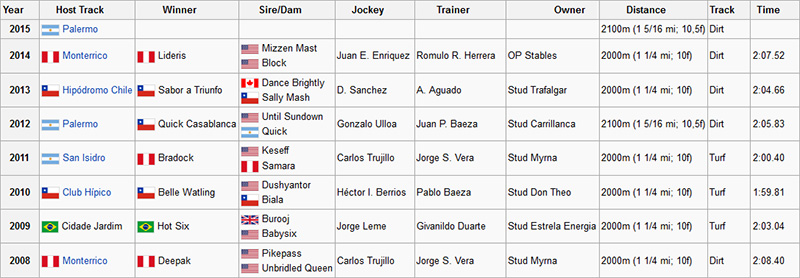 Спонсором самого престижнейшего мероприятия Латинской Америки, а также официальным хронометристом, является известная на весь мир швейцарская фирма Longines. Примечательна скачка также тем, что она проходит не на одном и том же ипподроме, и даже не в одной и той же стране. Longines Gran Premio Latinoamericano (Gr.1) – проводится ежегодно в разных странах, на разных ипподромах и разных покрытиях.