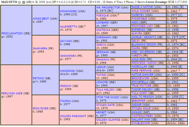 Педигри Макс Отто свободно от инбридинга, Northern Dancer встречается единожды в 6-м ряду по отцовской стороне через ветвь Nureyev.