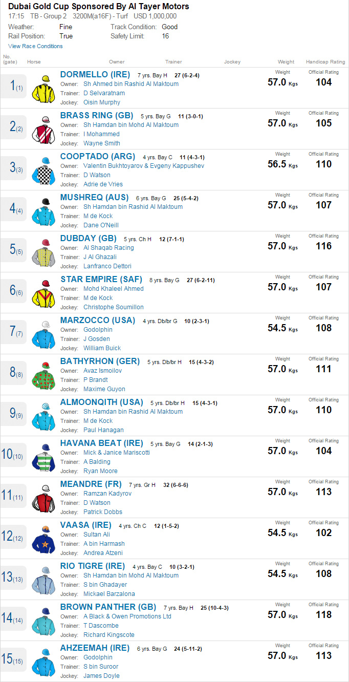 7-ми летний жеребец российского владельца Рамзана Кадырова, под кличкой Meandre (Slickly- Penne (Sevres Rose)) будет стартовать на Dubai Gold Cup (3200 метров) из бокса № 11, а Cooptado (Equal Stripes – Coordinada (Ride The Rails) – Валентина Бухтоярова и Евгения Каппушева, из бокса номер № 3.