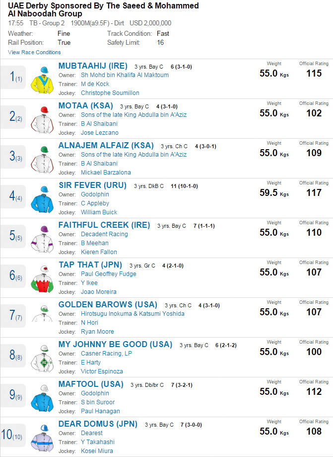 Предлагаем Вашему вниманию полную записку (racecard) на Godolphin Mile, Dubai Gold Cup и UAE Derby: