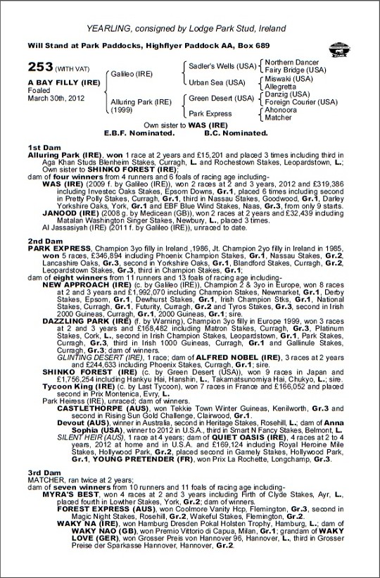 Мировой рекорд по годовалым кобылкам был побит на аукционе Tattersalls во второй день Октябрьских торгов годовичков, Книга 1, когда шейх Катара Джоан (Joaan) купил сестру победительницы Окса WAS (Galileo (IRE) (11.2f) — Alluring Park (IRE) (Green Desert (USA) от Галилео за 5000000 гиней. Эта сделка самая высокая в европейской истории аукционов, опередив Magic Romance, которая была куплена в 2006 году на декабрьском аукционе по кобылкам за 4,6 млн гиней. Цена продажи 5000000 гиней эквивалентна $ 8,4 млн. и 6,2 млн. евро.