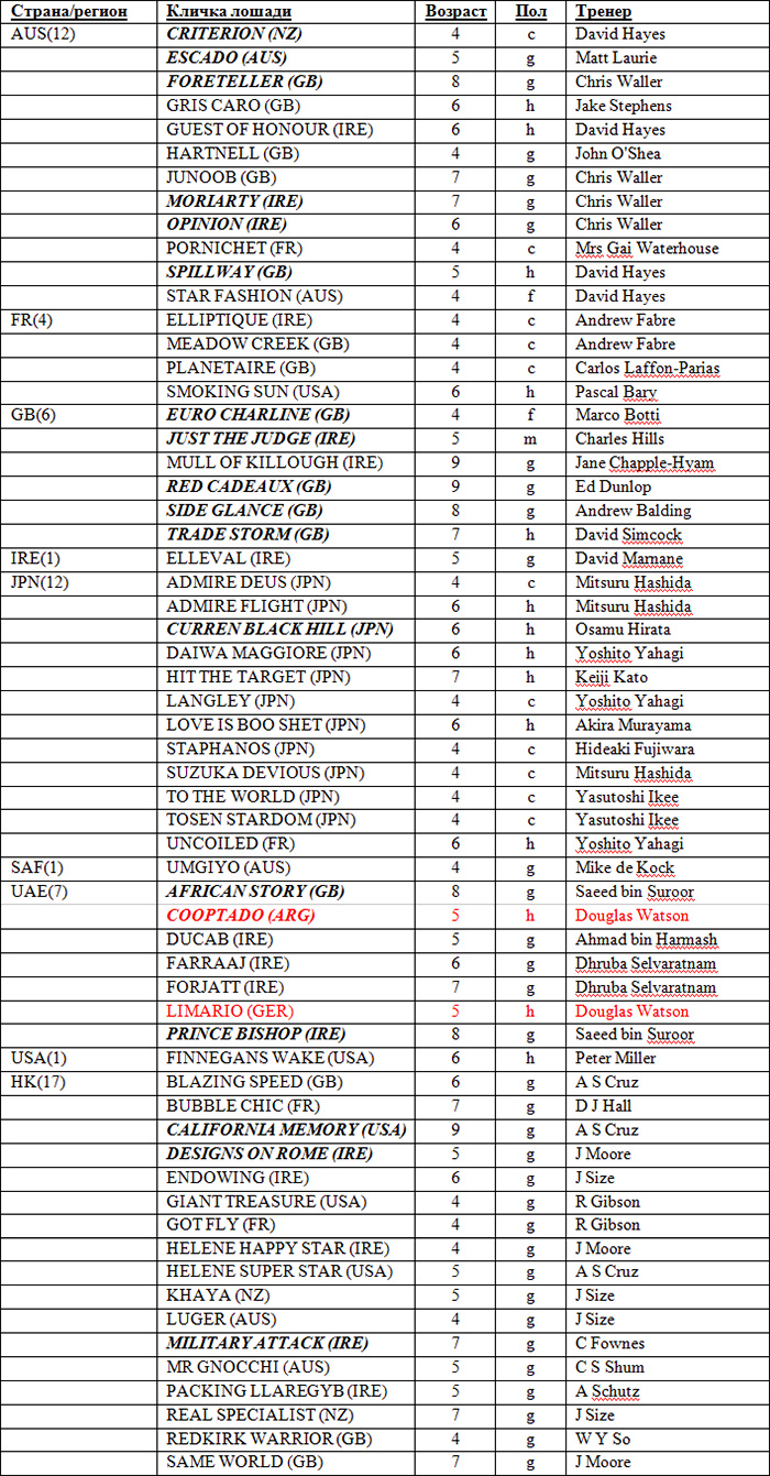 Предварительная запись на Gr.1 The Audemars Piguet Queen Elizabeth II Cup 19.03.2015, 09:34 Entries Entries: 61 (overseas: 44, local: 17) Group One winners: 18 Group One winners in bold and italics.